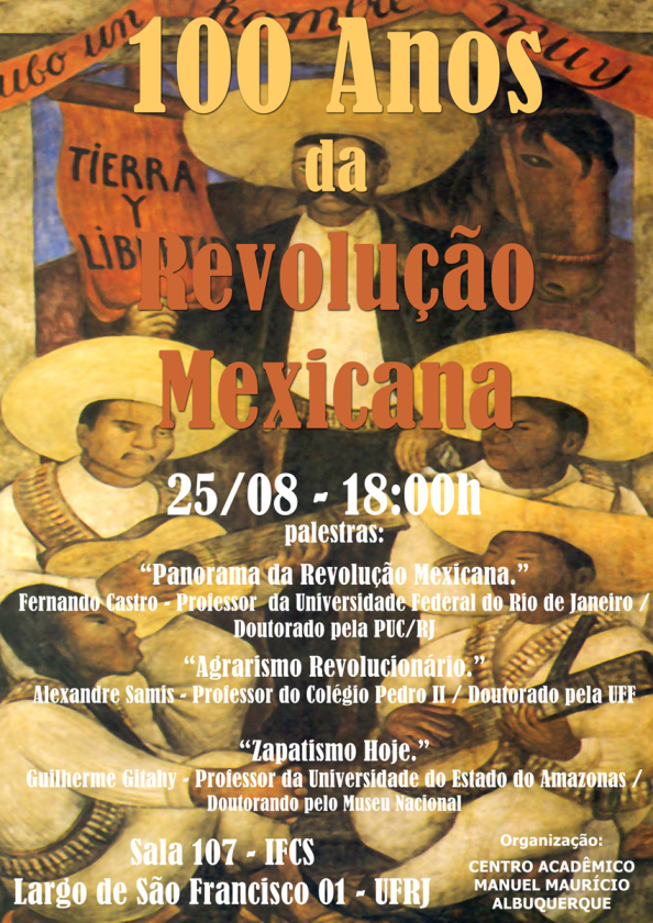Enviado por OP em qui, 19/08/2010 - 19:52 Data: quarta-feira, 25 Agosto, 2010 - 18:00Evento sobre os 100 Anos da Revolução Mexicana que será realizado no âmbito da calourada de História da UFRJ 2010/2. Por favor divulguem! Abraços Comentar Seu nome Comment * Switch to plain text editor Formato de texto Filtered HTMLPlain text Mais informações sobre os formatos de textoFiltered HTMLEndereços de sites e e-mails serão transformados em links automaticamente.Adds captions, from the title attribute, to images with one of the following classes: image-left image-right standalone-imageTags HTML permitidas: <a> <em> <strong> <cite> <blockquote> <code> <ul> <ol> <li> <dl> <dt> <dd>Quebras de linhas e parágrafos são gerados automaticamente.Plain textNenhuma tag HTML permitida.Endereços de sites e e-mails serão transformados em links automaticamente.Quebras de linhas e parágrafos são gerados automaticamente.
